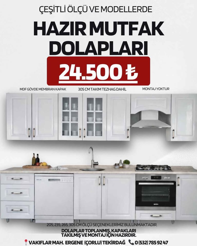 Sizler için takım halinde yer alan ürünler, birçok farklı ölçülerde de yer almaktadır. Böylece Çorlu hazır mutfak dolabı seçeneklerine bakanlar, birçok çeşit arasından kendilerine uygun olanı bulabilirler. Hazır mutfak dolabı tercih etmenin avantajlarından ilki elbette daha uygun fiyatlı olmasıdır. Böylece ciddi bir ekonomik fayda elde edebilirsiniz. Aynı zamanda bir diğer avantajı ise, bitmiş ve takım halini görebileceğiniz için daha kolay karar verebilirsiniz.