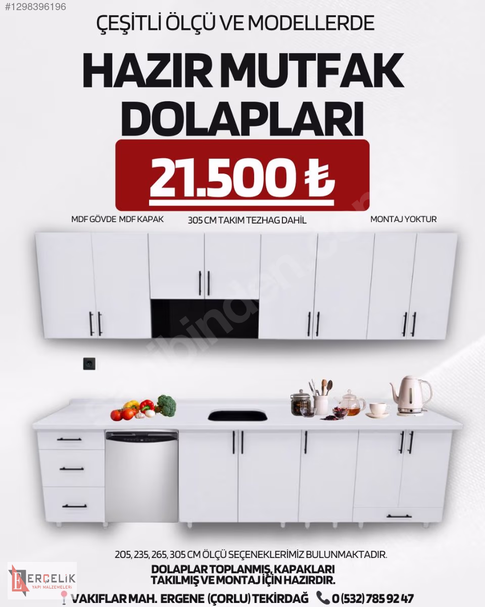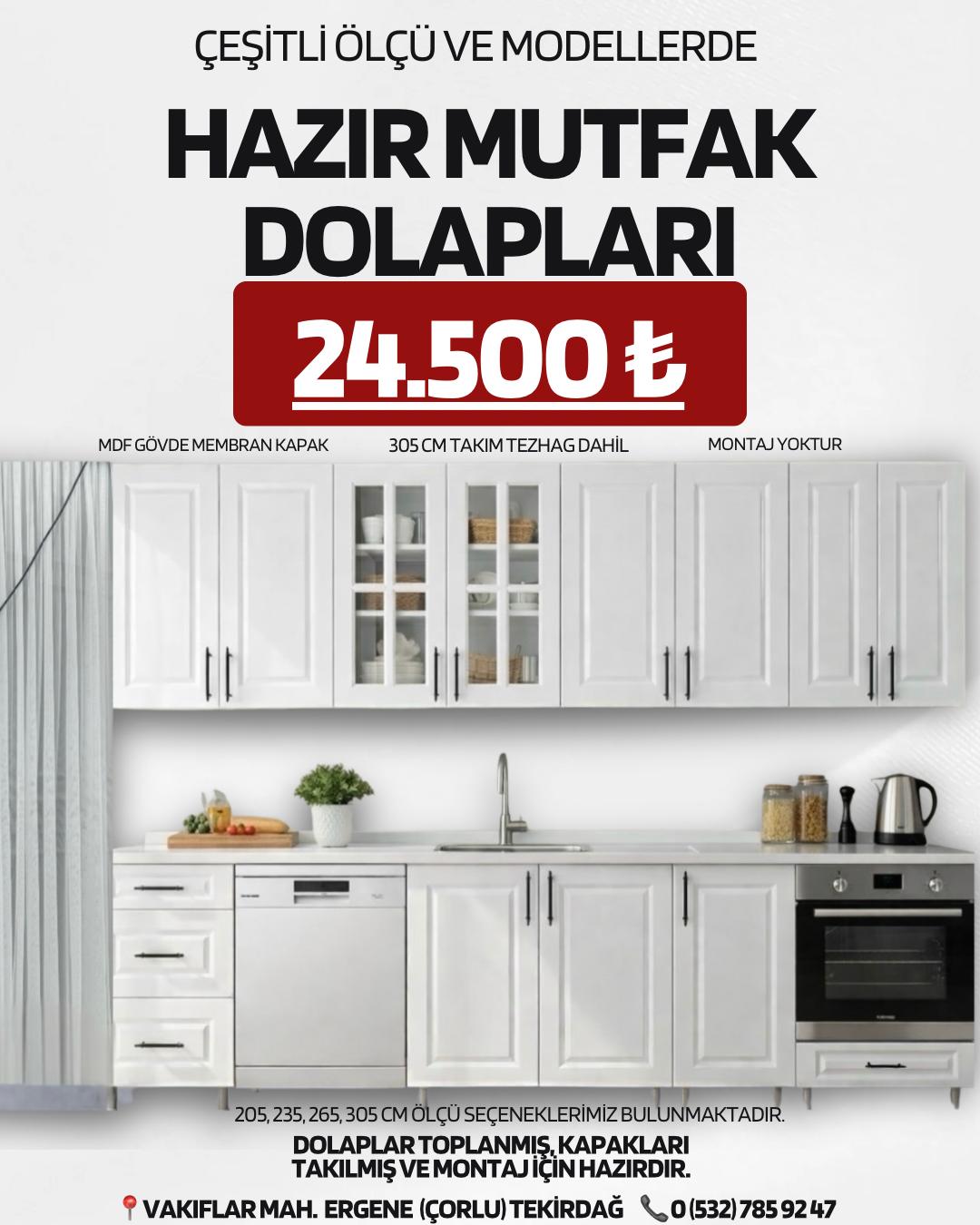 Hazır yani spot mutfak dolabı satış hizmetimiz için firmamıza kolaylıkla ulaşabilirsiniz. Mağazamızdan veya sitemizden mutfak dolabınızı seçebilir ve sipariş verebilirsiniz. Hazır mutfak dolabı özel ölçü üretilen mutfak dolaplarına göre çok daha uygun maliyetlidir. Çorlu'da hazır mutfak dolabının adresi Erçelik Yapı Malzemeleri.